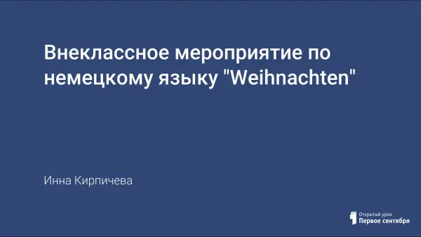 Сценарий календарного праздника «Weihnachten» предлагается для проведения тематического внеклассного мероприятия в декабре в рамках предметной Недели немецкого языка. Целями проведения данного праздника являются ознакомление учащихся с обычаями немецкого народа, сравнение с русскими рождественскими традициями в рамках «диалога культур», рекламная пропаганда для привлечения учащихся к изучению немецкого языка. В празднике могут принять участие люди немецкой национальности, проживающие на территории России. Для составления сценария использованы различные источники, изданные в России и Германии.