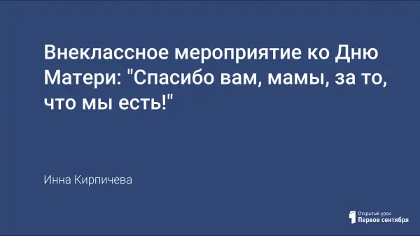Внеклассное мероприятие, посвященное Дню Матери, предлагается для учащихся 5–8-х классов и их родителей. Целью данного мероприятия является воспитание чуткого отношения к маме, бабушке и женщине вообще, развитие взаимопонимания между всеми членами семьи. Очередность конкурсных заданий позволяет проследить путь развития ребенка от младенчества до подросткового возраста. Для подготовки сценария использованы тексты стихов и песен советских и российских авторов, а текст заключительной песни написан автором статьи.