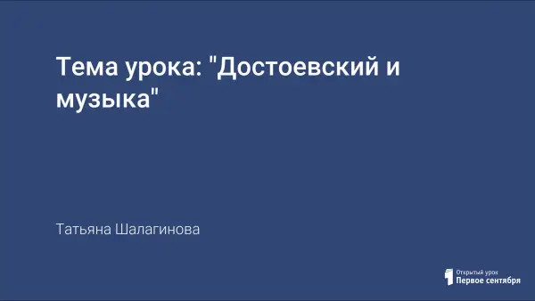 Урок «Достоевский и музыка» - это интегрированный урок литературы и музыки. Изучение духовного мира писателя и его творчества будет неполным, если не показать его связи с музыкой. Связь творчества Достоевского с музыкой многогранна. С одной стороны, это музыка и музыканты в жизни писателя, с другой стороны – музыка на страницах его произведений, воплощение его творчества в музыке. Конечно, в рамках одного урока невозможно осветить все проблемы, связанные с темой «Достоевский и музыка». Однако такой урок поможет глубже понять как личность писателя, так и его творчество.