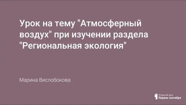 В программе курса "Экология" для студентов 1-го курса Каменск-Уральского педагогического колледжа изучается раздел "Региональная экология", включающая такие темы, как "Природные условия и природные ресурсы региона", "Основные источники и степень загрязнения среды", "Влияние загрязнения природной среды". В ходе изучения темы "Основные источники и степень загрязнения среды" проводится занятие на тему "Атмосферный воздух" (2 часа). В статье приведен конспект занятия на тему "Атмосферный воздух", мультимедийная презентация занятия, задания для организации работы 5 групп в ходе занятия, отчёты групп с презентациями. Материал статьи может быть использован учителями экологии, биологии.