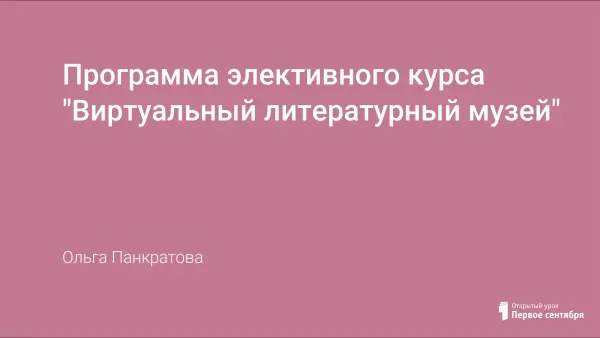 Данный элективный курс "Виртуальный литературный музей", на занятиях которого предполагается знакомство с интернет-коллекциями знаменитых литературных музеев мира, позволит учащимся ощутить как "живут" экспонаты, и даст возможность почувствовать себя зрителем в музее. Программа элективного курса рассчитана на 34 часа, предназначена для учащихся 10–11-х классов филологического профиля. По окончании курса учащиеся должны знать структуру литературного музея, уметь подобрать для такого виртуального музея экспонаты, дать им оценку, проникнуть в глубину художественно-образного замысла писателя, художника или композитора; применять полученные знания и умения в разработке различных творческих проектов, в организации праздников, конкурсов, в создании презентаций.