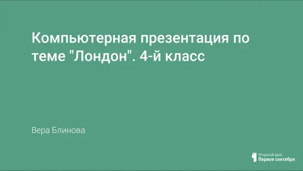 Компьютерная презентация к учебнику 4-го класса «English Student’s Book» И.Н. Верещагина, О.В. Афанасьева является дополнительным наглядным пособием в помощь учителю при изучении темы «Лондон» в 4-м классе. Визуальное восприятие учащимися данной темы повышает интерес к изучению культуры, истории и географии страны, изучаемого языка, развивает и улучшает лексические и грамматические навыки. Данный материал полностью охватывает текстовое содержание уроков 4-67 учебника.