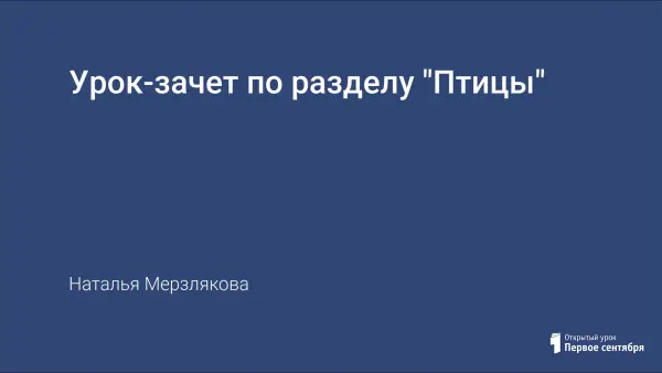Урок предназначен в качестве альтернативы традиционным контрольным работам. В ходе урока учащиеся должны будут продемонстрировать знания по внутреннему, внешнему строению птиц, их систематике и образу жизни, а также некоторые сведения, выходящие за пределы программы и представляющие интерес. Урок может быть адаптирован к классам различным уровней – от коррекционных до специализированных.