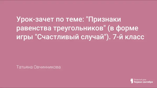 Я предлагаю вашему вниманию разработку урока-зачёта по геометрии в 7-м классе, целью которого является проверка степени усвоения учащимися признаков равенства треугольников. Урок проводится в форме игры "Счастливый случай". Такая форма выбрана не случайно, так как это только начало изучения геометрии, и очень важно сохранить заинтересованность детей в изучении геометрии, дать возможность в течение урока проявить себя каждому учащемуся.