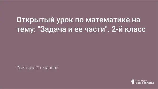 Данный урок являлся вводным в тему "Задача". На этом уроке ученики рассматривают задачи, решением которых являются примеры на повторение пройденной темы: состав 2-го десятка. Специфика данного урока заключается в том, что именно через исследование учащиеся самостоятельно делают выводы о составляющих задачи.