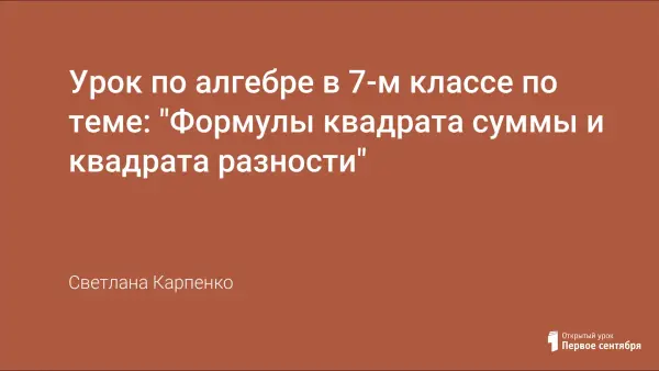 Урок по алгебре для 7-го класса закрепляет знания формул квадрата суммы и квадрата разности, формирует умение применять эти формулы для преобразования выражений и упрощения вычислений.