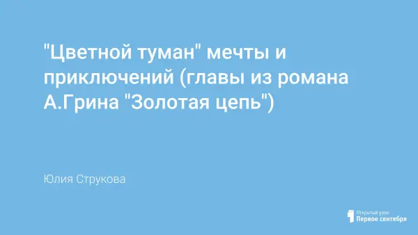 На данном уроке учащиеся знакомятся с творчеством Александра Грина, анализируют главы из его романа «Золотая цепь». Отвечая на поставленные вопросы, ученики приходят к выводу, что мир мечтаний и грез нередко помогает человеку пережить горести и скорби, а порой – стать творцом своей судьбы.