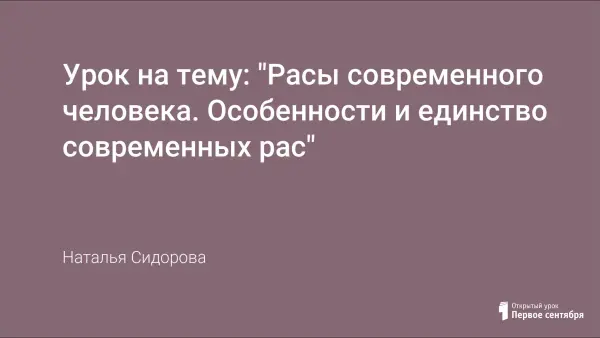 Урок проходит в форме семинарского занятия. Тема урока раскрывает биологические особенности человеческих рас, проводит анализ причин их возникновения. Приведены доказательства в пользу принадлежности всех людей Земли к одному виду – человек разумный. Человек разумный возник в результате биологической эволюции от одной из ветвей филогенетического древа отряда приматов. Раскрыты время и место возникновения человеческих рас, показаны механизмы расогенеза. Приведены доказательства несостоятельности теории расизма.