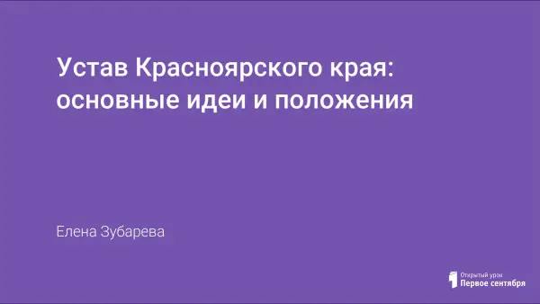 Урок посвящен новому Уставу Красноярского края, принятому 5 июня 2008 года. Учащиеся узнают на уроке об основном содержании Устава края и основах законотворческой деятельности на основе статей Устава, получают представление о принципах формирования и деятельности краевой власти, об основных направлениях социально-экономического развития края.