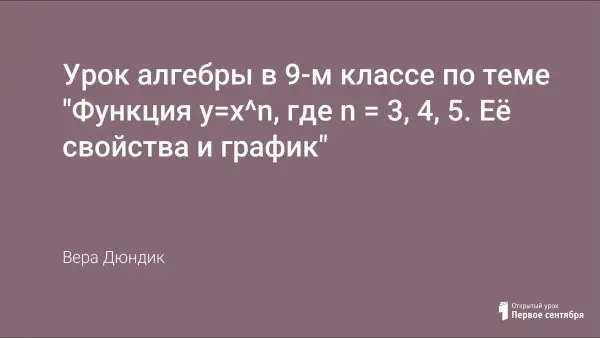 В ходе урока учащимся предложено самостоятельно исследовать функцию у=х^n при различных натуральных значениях n. На уроке организована работа в парах, применяются различные методы проверки самостоятельных работ, что позволяет каждому учащемуся разобраться в таких сложных вопросах, как «функция».