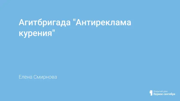 Агитбригада «Антиреклама курения» является одной из форм работы классного руководителя по направлению «Здоровье». Информация, представленная в агитбригаде, найдена и отобрана самими учащимися, театрализованная часть также разработана при их непосредственном участии. Эмоциональным фоном для восприятия информации служит мультимедийная презентация, созданная учащимися.