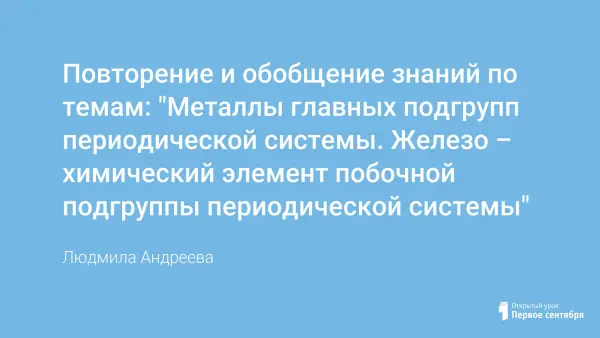 Данный урок комбинированный, на нем создаются условия учащимся для повторения и закрепления пройденного материала. Тема рассчитана на два урока в 10-м классе, ребята объединяются в группы, получают домашнее задание: подготовить материал о семействах металлов, где должны быть отражены: положение металлов в ПС, физические свойства, химические свойства, применение, залежи на территории Республики Коми.