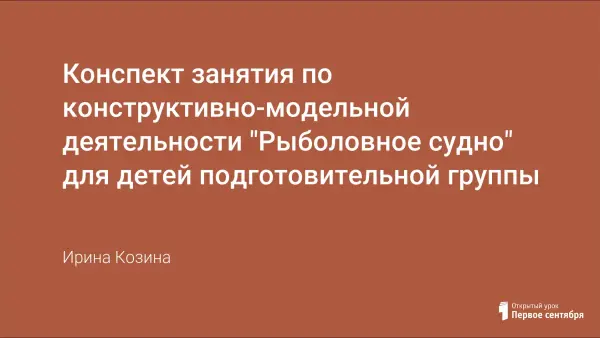 Цели занятия: закреплять знания детей об особенностях строения рыболовного судна, его помещениях и их назначении; побуждать детей к планированию деятельности, анализу выполненной работы; закрепить представления детей об организации и ведении промышленного рыболовства; развивать умение высказывать своё мнение. Активизировать в речи слова: рыболовное судно, корма, палуба, каюта, нос, трюм, промысловая рыба, рыболовные сети; совершенствовать умение самостоятельно создавать модели из разного конструктора (магнитного, лего, тико); закреплять умение передавать особенности строения рыболовного судна; развивать творческое мышление, фантазию.