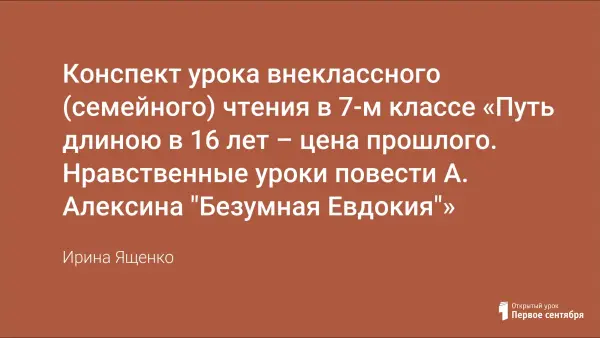 Предлагается урок семейного чтения «Путь длиною в 16 лет – цена прошлого. Нравственные уроки повести А. Алексина "Безумная Евдокия"» как способ развития интереса к чтению у учащихся и их родителей, речевой культуры, осуществление сотрудничества "ученик – родитель – педагог".