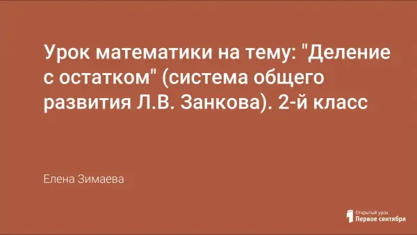 В данной работе учителям, работающим по развивающей системе Л.В. Занкова, предложен урок математики во 2-м классе по теме "Деление с остатком". Урок выстроен в соответствии с дидактическими принципами системы. Ведущей является деятельность учащихся при минимальной помощи учителя.