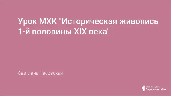 Ученики знакомятся с исторической живописью России первой половины 19 века. Цель данного урока: развитие интереса к исторической живописи как ведущему жанру Академии художеств в начале 19 века; воспитание чувства любви к прекрасному, любви к своей Родине, её историческому прошлому через предметы искусства. У детей развиваются навыки работы в группе, умения структурировать свое время и делегировать ответственность.