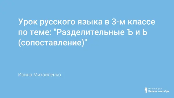 Урок русского языка в 3-м классе по теме "Разделительные Ъ и Ь (сопоставление)" – урок закрепления и обобщения знаний. Обучающиеся классифицируют изученный материал, сопоставляют правила написания разделительных Ъ и Ь знаков, самостоятельно формулируют тему урока, образовательную цель урока, тему минутки чистописания, принимают непосредственное участие в выведении новых правил и терминов. На протяжении всего урока прослеживается использование методики Г.А. Бакулиной "Интеллектуальное развитие младших школьников на уроках русского языка".