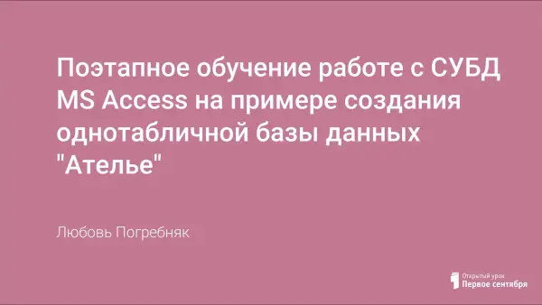 Практическая работа для учащихся 8–9-х классов. Работа предназначена для обучения школьников навыкам работы с СУБД Access на конкретном примере. Работа включает в себя практические задания и небольшие теоретические пояснения к ним. В результате поэтапного выполнения предлагаемой работы обучающиеся приобретают навыки создания основных объектов приложения Microsoft Access: таблиц, форм, запросов и отчетов.