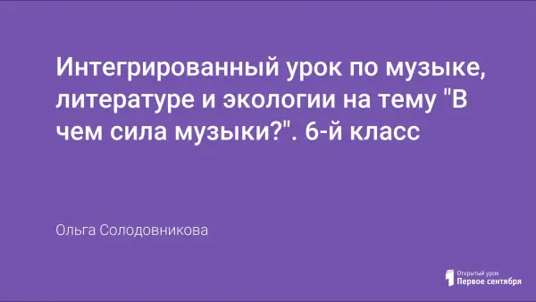 Урок музыки по теме "В чем сила музыки?" является интегрированным уроком музыки, литературы, экологии. Он состоит из трёх частей: 1) на основе литературного материала (мифы, сказки, народный фольклор) показана поэтичность образа лебедя; 2) внимание детей сосредотачивается на музыкальных произведениях "Увели нашу подружку" из 4 ч. концерта "Лебедушка" В.Салманова и "Лебединая верность" Е.Мартынова, разбираются средства музыкальной выразительности, вводятся новые понятии: а капелла, речевая декламация; 3) учащимся предлагается написать обращение к людям с просьбой беречь и охранять природу. В заключение урока делается вывод о воздействии музыки на человека.