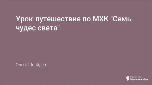Урок-путешествие "Семь чудес света" по МХК в 5-м классе является обобщающим после изучения темы " Сюжеты и образы античной мифологии". Учащиеся вместе с учителем ведут большую подготовительную работу. Они по желанию выбирают себе одно из семи чудес света, к сообщению о котором готовятся заранее. Эти же дети коллективно готовят костюмы древнегреческих богов, изготавливают "путеводитель" по семи чудесам света, проявляя свою творческую фантазию. "Путеводитель" представляет собой карту с описанием и рисунками семи чудес света. Работа на уроке строится следующим образом: учитель произносит вступительное слово; основной ход урока – выступления учащихся. Задача учителя – быть связующим звеном между выступлениями учащихся, создать на уроке атмосферу путешествия. По ходу урока важно продумать музыкальный фон; а также подобрать иллюстрации, слайды, видеофильмы всех чудес света; иллюстрации с картин художников и скульптурные изображения древнегреческих богов; карта-путеводитель поможет путешествию.