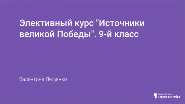 Элективный курс расширят знания по разделу "Великая Отечественная война". Актуальность программы определяется тем, что в учебниках по отечественной истории этойпроблеме уделяется мало часов. Учащиеся получают навыки отстаивать различные точки зрения на ход войны, опираясь на фактический материал. Курс воспитывает у учащихся патриотизм, любовь к родине.