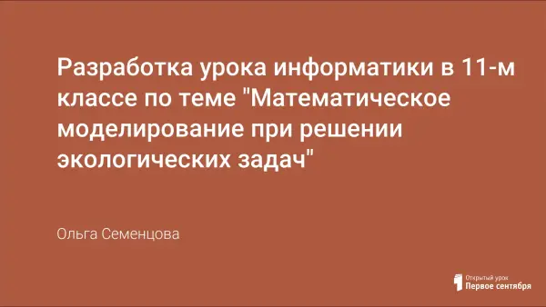 Урок "Математическое моделирование при решении экологических задач" направлен на систематизацию представлений учащихся по математическому моделированию, демонстрацию применения метода математического моделирования для решения экологических задач, установление и констатацию связи наук математика–экология–информатика; на повышение уровня экологической грамотности учащихся, воспитание ответственности за последствия реализации принятых решений; на воспитание умения здраво и логично мыслить, принимать обдуманные, рациональные решения, формирование компьютерной грамотности.