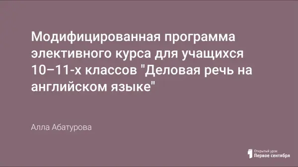 Программа рекомендована в качестве элективного курса в 10–11-х классах социально-экономического и информационно-технологического профилей. Курс ориентирован на реализацию дидактических принципов: ориентированность на практику; ориентированность на личность; краткосрочность; модульность. Обучение предполагает подготовку к будущей профессиональной деятельности. Цель курса – обучение основам делового общения в устной и письменной формах. Каждая из 17 учебных тем курса включает текст, глоссарий, лингвистический комментарий, тест.
