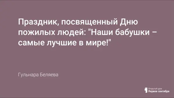 В работе представлен сценарий праздника, посвященного Международному дню пожилых людей. Он проводится с целью развития чувства уважительного отношения к пожилым людям, умения говорить открыто, не стесняясь, о своей любви к бабушкам и дедушкам.