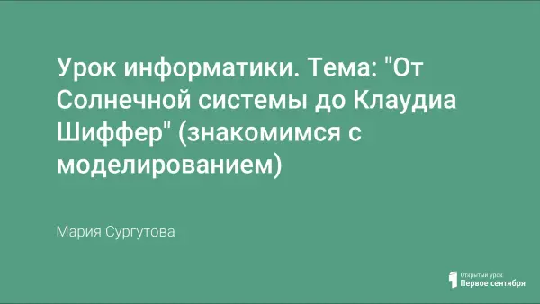 Тема "Моделирование" очень важная и значимая в школьном курсе информатики, поэтому необходимо начинать ее изучение как можно раньше. Например, с 5-го класса. Создавая игровые ситуации, подвести ребят к понятиям "модель", "моделирование", объясняя при этом, что на каждом учебном предмете они занимаются ничем иным как построением моделей: математических, физических, текстовых. Ведь умение построить модель объекта, явления или процесса - это не что иное, как владение языком изучаемой науки. А классификация моделей, представленная на данном уроке, вполне доступна для школьников этого возраста.