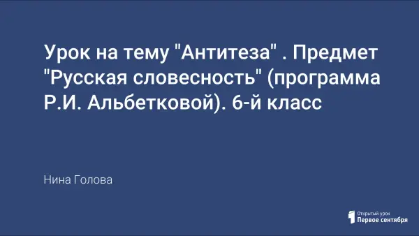 Урок по "Русской словесности" на тему "Антитеза" разработан с учётом рекомендаций автора программы Р.И. Альбетковой, исходя из опыта учащихся. С этой целью использован частично-поисковый метод и групповая форма работы. Логический стержень урока: доказательство того, что антитеза – средство изобразительное и выразительное.
