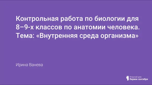 Представлен вариант контрольной работы (14 заданий) по биологии для 8–9-х классов по анатомии человека. Тема: «Внутренняя среда организма».