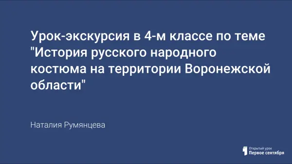 Урок отражает систему работы по расширению представлений учащихся об искусстве, приобщению к истокам народного искусства и художественных представлений народа. В ходе подготовки к уроку учащиеся познакомились с дополнительной литературой по истории народного костюма Воронежской губернии, традиционными обрядами Воронежского края, которую использовали в своих сообщениях. Таким образом, ребята стали соавторами урока, что повысило их активность и интерес.