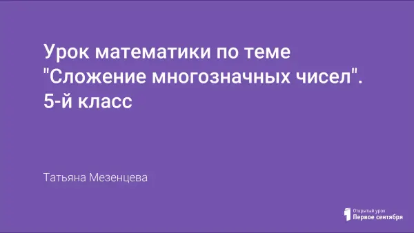 Урок математики в 5-м классе по теме "Сложение многозначных чисел" относится к разделу "Натуральные числа". Данный урок относится к типу изучения и первичного закрепления новых знаний, повторения и систематизации базовых знаний начальной школы. Изучение темы проходит с помощью компьютерной презентации. Закрепление изученного материала осуществляется в результате решения индивидуальной карточки с использованием образца. Проверка усвоения изученного материала осуществляется через тест.