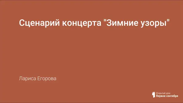 В статье представлен сценарий новогоднего концерта «Зимние узоры» обучающихся музыкально-хоровой студии. Сценарий имеет своей целью обеспечение условий для проявления творческих способностей детей, создание праздничной предновогодней атмосферы.