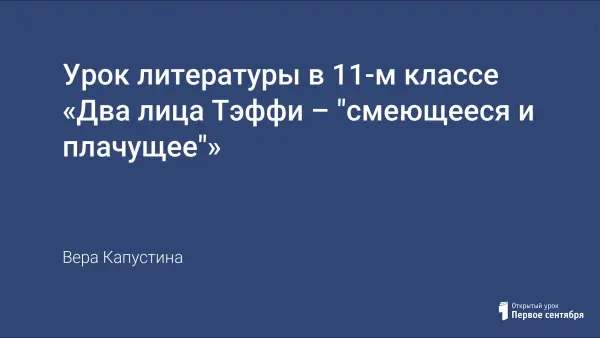 Творчество Тэффи на уроках литературы в 11-м классе изучается обзорно. Пристальное внимание к слову этой удивительной писательницы начала XX века принесет юному читателю много наслаждения и открытий. Форма урока – литературный салон – оправдана тем, что сама Тэффи всегда и везде собирала салоны.