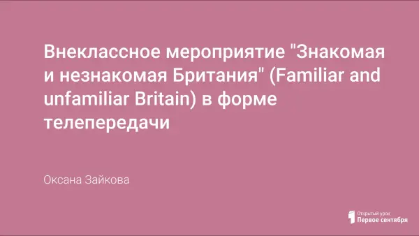 Данное внеклассное мероприятие было проведено в 8-м классе. Мероприятие проходило в форме телепередачи. Её цель - познакомить учащихся с интересными фактами по географии, истории, культуре Великобритании, а также отразить черты характера англичан. Телепередача состоит из вступления; пяти историй, посвященных странам Британии, а также истории создания флага; двух сценок, раскрывающих образ жизни британцев. Такое мероприятие призвано продемонстрировать достижения в овладении предметом.
