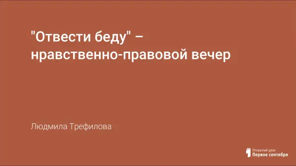 Педагог должен помнить, что, воспитывая ученика, он влияет, в первую очередь, на воспитательный потенциал семьи. Как известно, родители - главные воспитатели ребенка. Если, разумеется, это настоящие, заботливые, вдумчивые родители, именно с ними и ведется целенаправленная работа. Семьи, находящиеся в социально-опасном положении, как правило, остаются в стороне. "Отвести беду" - нравственно-правовой вечер - одна из форм работы с родителями.