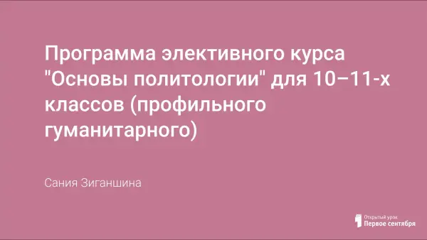 Курс для 10–11-х классов гуманитарного профиля. Курс "поддерживает" изучение предмета "Обществознание" на заданном профильном уровне, расширяет и углубляет политологические знания учащихся. Среди задач курса особое внимание уделяется организации самостоятельной работы учащихся, отработке навыков исследовательской деятельности, составлению и защите проектных работ, что позволяет в процессе обучения перейти от информационного к деятельностному подходу и снять перегрузку учащихся. Программа модифицированная, составлена на основе программы курса "Политика и право" под ред. В.Кривошеева, М.Шилобода.