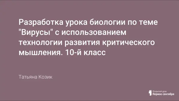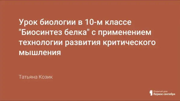 Представлен конспект урока биологии в 10-м классе "Биосинтез белка" с использованием технологии развития критического мышления. Современный социальный заказ системе образования связан с формированием у выпускников личностных качеств, которые были бы адекватны ситуации динамических изменений, происходящих в обществе. Это навыки системного анализа, определенность собственной позиции, способность к критическому мышлению. Результативность обучения в современных условиях во многом связана с осознанием необходимости замены малоэффективных вербальных, объяснительно-иллюстративных способов новыми развивающими, личностно-ориентированными приемами. Многообразие таких приемов представлено в образовательной технологии Открытого образования "Критическое мышление в процессе чтения и письма".