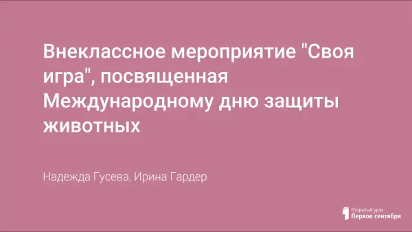 Внеклассное мероприятие "Своя игра" посвящается Международному дню защиты животных. В игровой форме учащиеся повторяют разнообразие классов животных и их представителей. Занимательные задания развивают интерес к различным представителям животного мира, желание больше узнать об их жизни, повадках, приспособлении к условиям жизни.