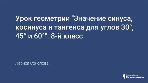 Урок изучает новый материал по теме "Значение синуса, косинуса и тангенса для углов 30°, 45°, 60°". Применяются информационные технологии, учитель решает несколько задач: повышает мотивацию учащихся, визуализирует изучаемый материал, интенсифицирует труд.