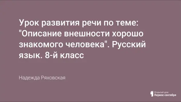 Данный урок поможет преподавателям русского языка и литературы сформировать представления учащихся о таком виде описания, как описание внешности; провести целенаправленную работу над деталями портрета, отобрать и записать с учащимися материал для описания общего впечатления о человеке.
