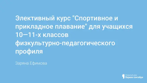 Программой данного элективного курса предусмотрено изучение теоретических вопросов, общая физическая подготовка, специальная физическая подготовка пловцов на суше, а так же освоение, закрепление и совершенствование умений и навыков в воде: совершенствование способов спортивного плавания и изучение прикладного. Завершается курс защитой исследовательских проектов и выполнением итогового тестирования (контрольные соревнования).
