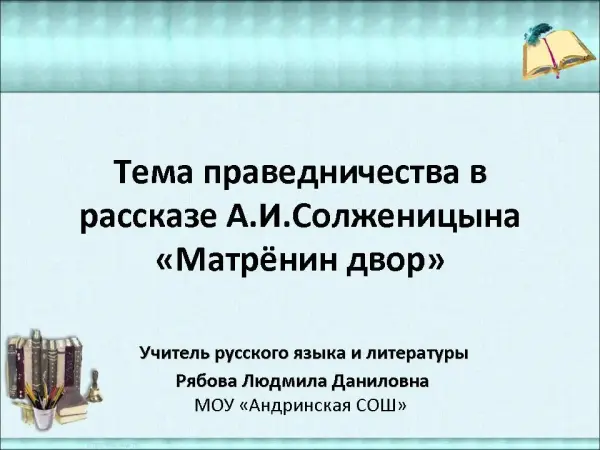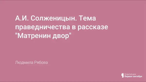 Урок направлен на раскрытие вечных ценностей русской духовной культуры: праведность, нестяжательство, естественность, простота, человечность, смирение, терпение. Цель данного урока: подвести обучающихся к осмыслению образа Матрены как праведницы земли русской, узнать лексическое значение слов «праведник» и «праведничество». Поняв суть темы на примере рассказа А.И. Солженицына, обучающиеся позднее сумеют постичь и глубину характеров героев Л.Н. Толстого, Ф.М. Достоевского, писателей ХХ века.