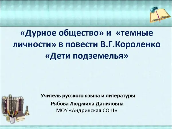 Урок изучения нового материала направлен на обучение частичному анализу художественного произведения через исследование текста, картин русских художников, творческие работы детей. Основная дидактическая задача этого урока – проанализировать причинно-следственные связи мира чувств ребенка, характер его взаимоотношений с взрослыми и окружающей действительностью на материале повести "Дети подземелья".