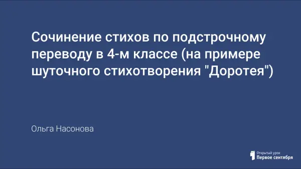 На уроке русского языка была предпринята попытка обучения учащихся элементам поэтического перевода с подстрочника, а точнее, превращению прозы, написанной на русском языке, в поэтическую форму (на материале шуточного стихотворения "Доротея", написанного в оригинале на французском языке). Цель работы: показать детям на новых для них, необычных примерах, как богат родной язык, какие он таит в себе безграничные возможности, и заинтересовать их таким сложным делом, как стихосложение. В статье приведены примеры получившихся у учащихся отдельных строф и стихотворений.