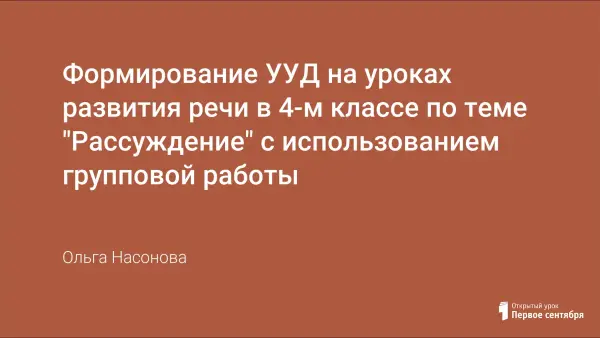 В статье описывается опыт работы в начальной школе с текстом-рассуждением, как в плане обучения его пониманию, так и в плане формирования алгоритма грамотного создания собственного рассуждения. Приведен конспект урока развития речи в 4-м классе (с использованием групповой формы работы) по восстановлению деформированного доказательства с созданием собственных тезиса и вывода. Автор считает, что подобная форма организации урока в большой степени также формирует и все виды УУД.