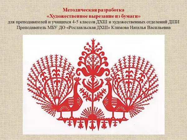 Презентация представляет собой авторскую методическую разработку для выполнения творческих проектов в технике художественного вырезания из бумаги для учащихся 4–5-х классов ДХШ и художественных отделений школ искусств. В презентации представлен оригинальный иллюстративный материал к уроку по lданной теме. При этом содержание практической работы обучающихся может выбираться преподавателем индивидуально и затрагивать разные уровни сложности: от вырезания снежинок до выполнения творческого проекта.