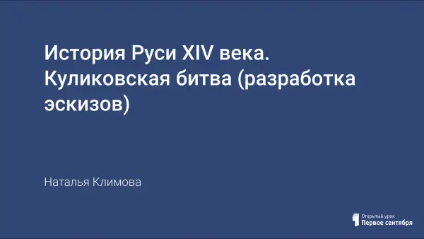 Презентация по теме «История Руси XIV века. Куликовская битва» (разработка эскизов) представляет собой методическую разработку для выполнения творческих проектов по учебному предмету «Композиция станковая» в 3–4-х классах ДХШ и художественных отделений школ искусств. Она может быть использована на занятиях преподавателями ДХШ и художественных отделений школ искусств, а также на уроках в общеобразовательной школе по соответствующей теме. Объяснение нового материала разбито на блоки. После изложения каждого блока обучающимся предлагается рассмотреть слайды презентации уже не в качестве иллюстраций к рассказу, а как варианты разных композиционных решений. К концу объяснения у учащихся должно быть выполнено несколько эскизов. Продолжительность занятия – 80 минут.
