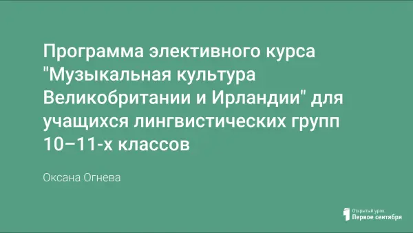 Элективный курс "Музыкальная культура Великобритании и Ирландии" предназначен для учащихся лингвистических групп 10-11-х классов. Данный курс дает возможность получить достаточно полное представление о национальном своеобразии музыкальной культуры стран, язык которых учащиеся изучают в профильных группах. Предлагаемый курс в популярной форме знакомит учащихся с различными произведениями народного, классического и современного музыкального искусства Великобритании и Ирландии, с творчеством отдельных выдающихся композиторов ХV-ХХ веков.